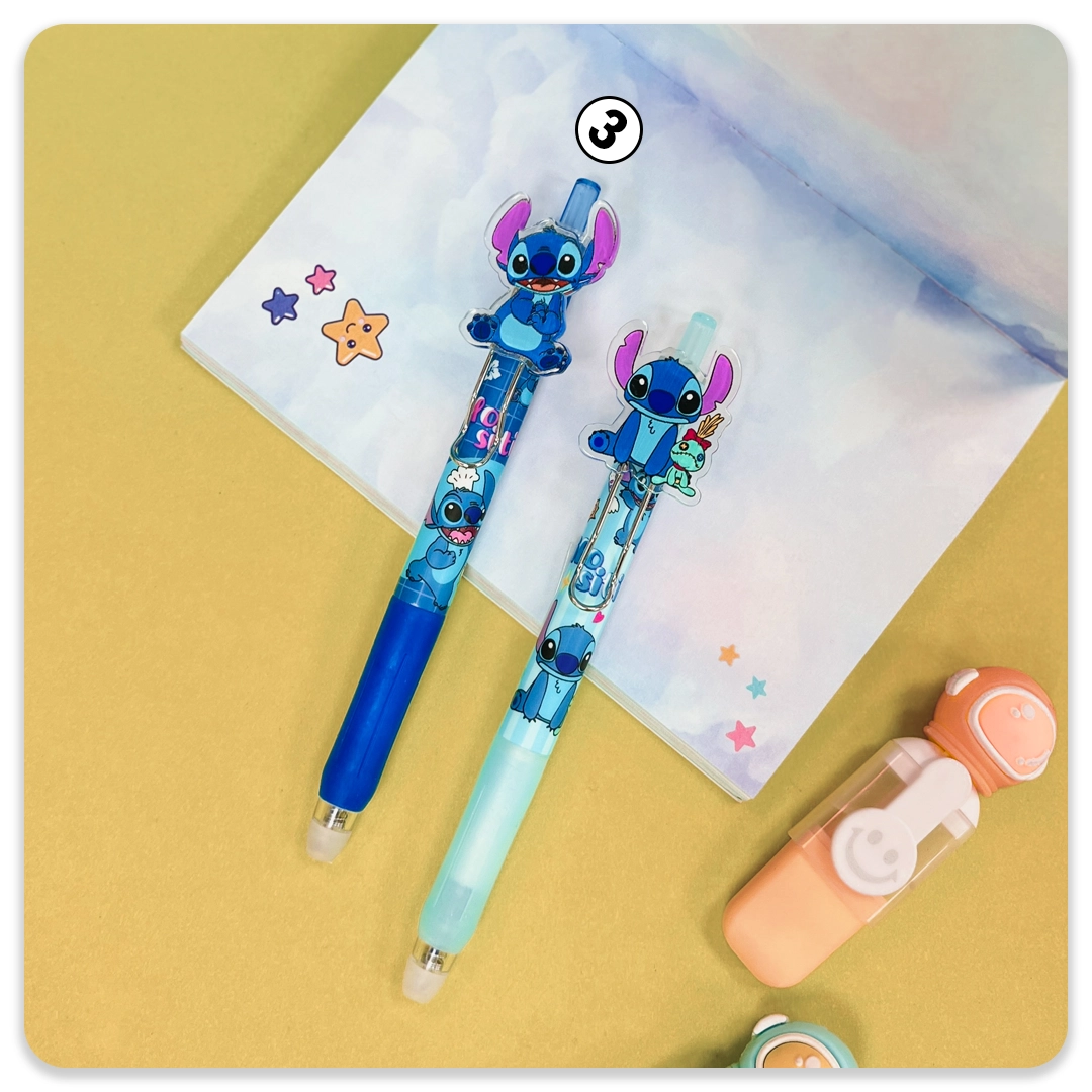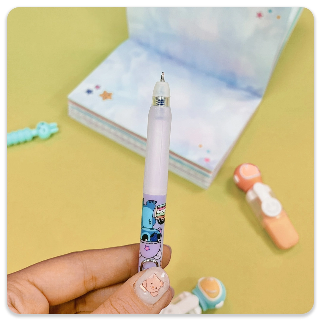 سایز: 14*2 سانتی متررنگ جوهر: آبیرنگبندی: آبی، سفید، بنفش، آبی آسمانیطرح استیکر لایفدر قسمت نوک روان نویس یک پاک کن کار شده که می توانید متن نوشته شده با خودکار را پاک کنید.