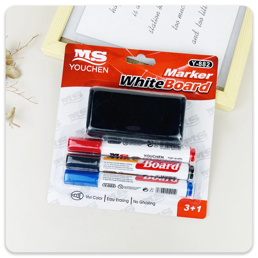 خرید ست ماژیک وایت برد و تخته پاک کنیکی دیگر از لوازم کاربردی در حوزه لوازم تحریر ماژیک و وایت برد است. این روزها استفاده از تخته وایت برد بسیار ترند شده است. ست ماژیک وایت برد و تخته پاک کن به شما کمک می کند که دیگر خیالتان از بابت نوشتن بر روی برد راحت باشد. این ست از سه رنگ ماژیک آبی، مشکی و قرمز و یک تخته پاک کن باکیفیت ساخته شده است. نوک قلم ماژیک های وایت برد گرد می باشد و نوشتن را برای شما راحت می کند. زمانی که یک ست را به صورت کامل خریداری می کنید خیالتان از بابت نوشته باکیفیت و پاک کردن بدون نگرانی از ماندن لک راحت خواهد بود.